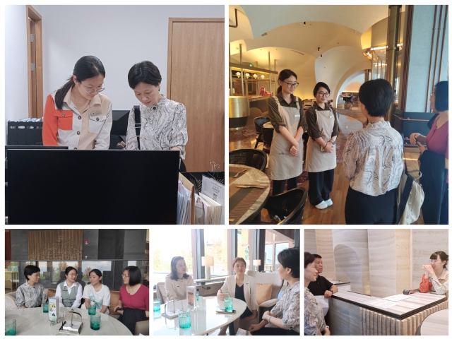 公司目前共有11位员工分别在两家酒店的总机、礼宾、水疗、西餐厅、咖啡厅、大堂吧等多个岗位实习,2位毕业生在总台和财务部工作。老师们走访了所有员工的工作岗位,考察员工的工作环境,了解他们的收获与成长,倾听他们的感受与困惑。老师们还走进宿舍,了解员工的住宿环境和生活状况。